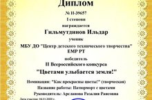 20 ноября 2020 года под руководством педагога ДО объединения «Технология художественного творчества» Арслановой Разалии Раисовны, ученик Гильмутдинов Ильдар получил диплом I степени во II Всероссийском конкурсе «Цветами улыбается земля», педагог получила благодарственное письмо. Поздравляем!
