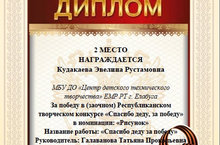 11.07.2020 г. подведены итоги Республиканского конкурса, посвященного 75 - лет победы в ВОВ «Спасибо деду, за победу». В котором под руководством педагога ДО Галаванова Т.П., Кудакаева Эвелина получила диплом II степени обучающаяся в объединение «НТМ», Мухаметзянова Эльвина получила сертификат за участие. Поздравляем!!!