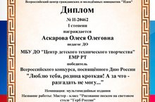 17.07.2020 г. подведены итоги Всероссийского конкурса, посвященного Дню России «Люблю тебя родина кроткая! А за что разгадать не могу…». В котором педагог ДО Аскарова О.О получила диплом I степени в номинации мультимедийные издания. Поздравляем!!!