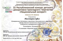 2020 елның 14 маенда «милли колорит»III Республика балалар декоратив-гамәли иҗат конкурсына йомгак ясалды. Анда педагог О .О. Кузнецова, О. Пальчикова җитәкчелегендә «дизайн нигезләре» берләшмәсенә укучы София III дәрәҗә диплом алды. Котлыйбыз!!!