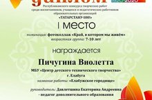 2 марта 2020 года учащаяся объединения "Азбука пешехода" Пичугина Виолетта под руководством педагога ДО Давлетшиной Екатерины Андреевны получила 1 место в Республиканском конкурсе творческих работ среди воспитанников, учащихся и педагогических работников «Татарстану – 100!» в номинации фотоколлаж «Край, в котором мы живем» Поздравляем!