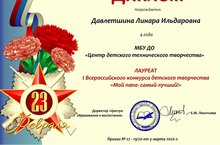10 марта 2020 года Давлетшина Линара под руководством Давлетшиной Екатерины Андреевны стала лауреатом I всероссийского конкурса «Мой папа-самый лучший». Педагог ДО получила благодарственное письмо. Поздравляем!