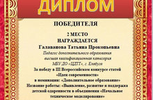 27 января 2020 года в III Всероссийском конкурсе статей «Идеи современности» в номинации «Дополнительное образование» Галаванова Татьяна Прокопьевна заняла 2 место. Поздравляем!!!