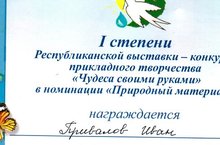 8 декабря завершила свою работу республиканская выставка- конкурс прикладного творчества « Чудеса своими руками», которая проходила в МБУ ДО "ДЭБЦ" ЕМР РТ. На выставке- конкурсе участвовали дети из различных районов нашей республики. В данной выставки приняли участие учащиеся объединения "Технология художественного творчества": Сазонова Викторя, Каримов Дмитрий, Привалов Иван под руководством ПДО Нечипорук Ф.А. В номинации "Природный материал" Привалов Иван занял 1 место.