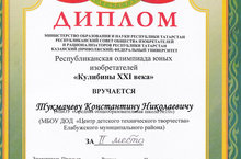 С 19 по 20 апреля 2016 года на базе Лицей-интерната «ИТ-лицей К(П)ФУ» Приволжского района г. Казани состоялся финал олимпиады IX Республиканской олимпиады юных изобретателей «Кулибины ХХI века». Для участия в Финале были отобраны 42 проекта 20 муниципальных образований Республики Татарстан. Ученики представили на суд жюри много интересных рационализаторских предложений. В данной олимпиаде Центр детского технического творчества представлял ученик СОШ №10 Тукмачев Константин (педагог Гуремулта В.В.) По итогам олимпиады в номинации «Город» (старшая группа) он занял 2 место. Поздравляем!!!