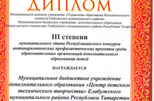 Подведены итоги муниципального этапа Республиканского конкурса антинаркотических профилактических проектов среди образовательных организаций дополнительного образования детей. В результате Центр детского технического творчества награжден дипломом Ш степени.