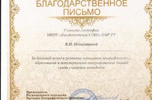 24 марта 2017г в КФУ (г.Казань) прошёл II-Республиканский форум учителей географии РТ «География, географическое образование и туризм», где наш учитель географии Небогатова Валентина Ильинична получила сертификат и благодарственное письмо за большой вклад в развитие школьного географического образования и популяризацию географических знаний среди молодёжи .Поздравляем!!