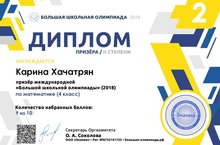 Подведены итоги международной «Большой школьной олимпиады» по математике. Учащиеся нашей школыХачатрян Карина, ученица 4 класса,Башков Владислав, ученик 5 класса,Тухватуллина Аделина, ученица 6 класса,Шахматова Дарья, ученица 6 классаприняли активное участие в олимпиаде, за что были награждены дипломами и сертификатами.Молодцы! -
