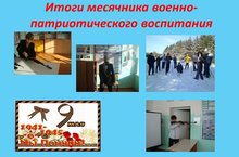 Подошёл к концу месячник военно-патриотического воспитания. Все мероприятия месячника носили массовый характер. По итогам месячника подведены итоги, награждены победители конкурсов и соревнований, оформлены сценарии мероприятий, фотоотчёты.Далее...