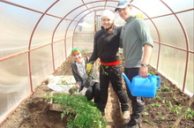 В теплице пересаживали помидоры, перцы, капусту, баклажаны. Юноши помогают девушкам.
