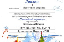 Поздравляем с победой в Муниципальном конкурсе-выставке декоративно-прикладного творчества "Новогодний карнавал" учащихся ДХШ №2: Калмыкову Валерию - 1 место, Миннегалееву Алию - 1 место, Мухаметзянову Элину - 2 место, Павлову Алёну - 3 место, Титову Камиллу - 3 место, Шарафееву Камиллу - 3 место, Ялалетдинову Яну - 3 место. Желаем дальнейших побед в конкурсах.