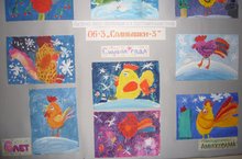 На работу всех зовет...Выставка работ детей 6 лет ( преподаватель Аммосова Марина Александровна) "Символ года" оформлена на выставочном стенде.