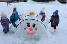 Воспитанники младшей группы на прогулке весело проводят время. На их участке появились фигуры сказочных персонажей, вылепленных из снега. За длинные праздничные выходные ребята соскучились по снежным друзьям.