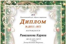 Учащаяся объединения "Мир творчества" Рамазанова Карина приняла участие во Всероссийском конкурсе "В свете елочных огней" и была награждена дипломом участника в номинации "Поздравительная открытка"