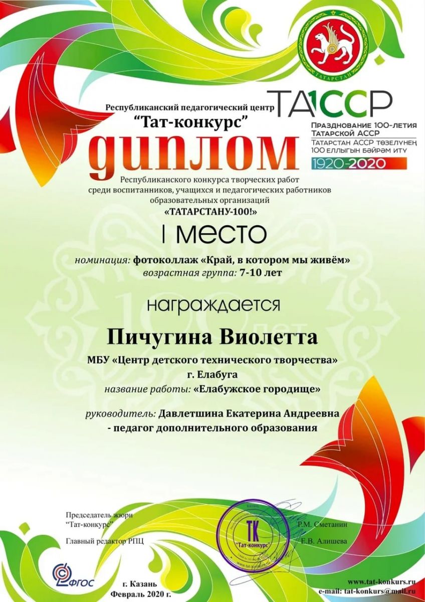 Пичугина Виолетта - 1 место, Республиканский конкурс творческих работ "Татарстану-100!"