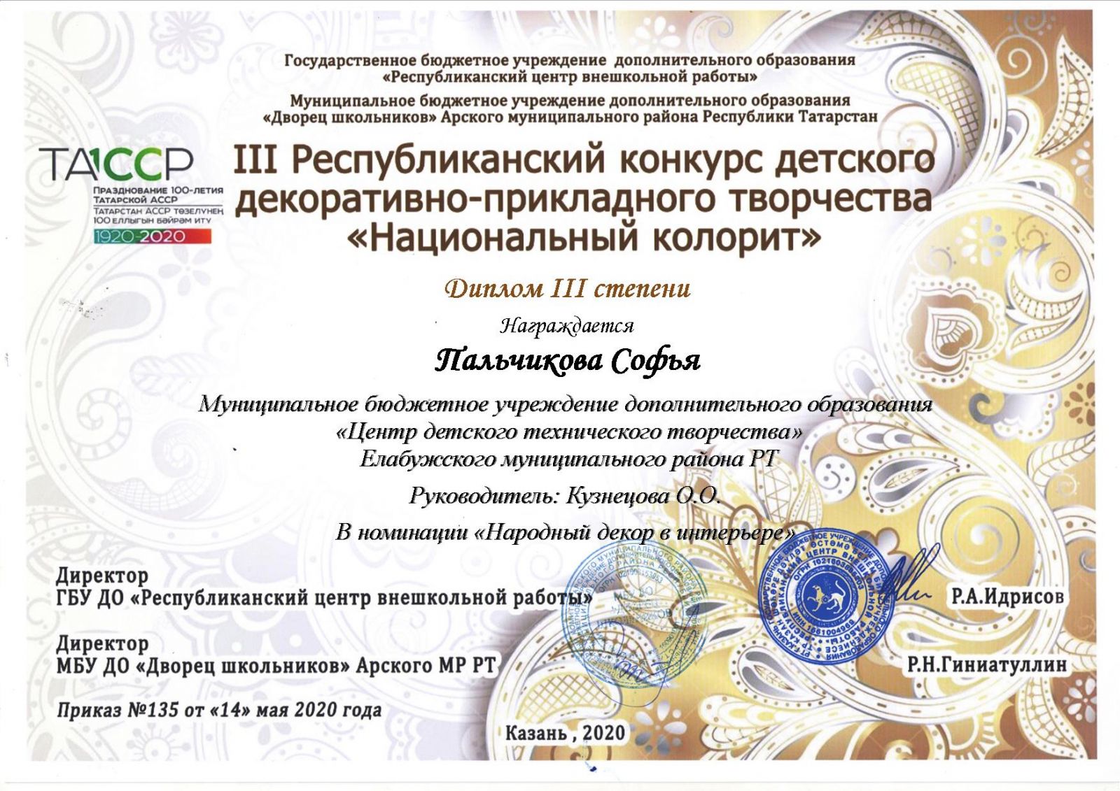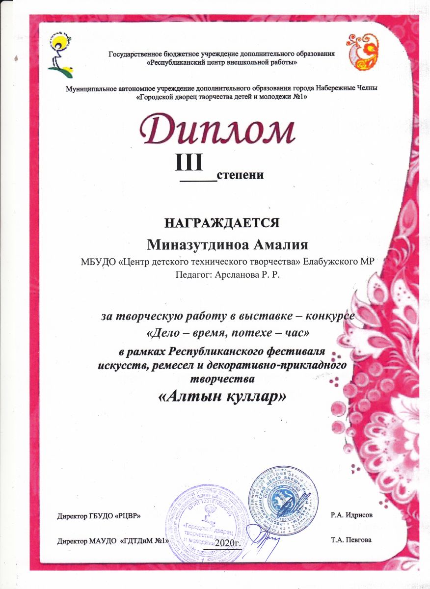 Пальчикова Софья - диплом 3 степени, 3-й Республиканский конкурс детского ДПТ "Национальный колорит"