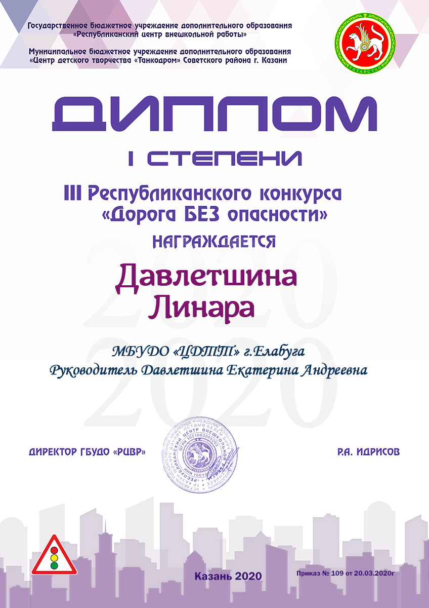 Давлетшина Линара - диплом 1 степени, 3-й Республиканский конкурс "Дорога БЕЗ опасности"