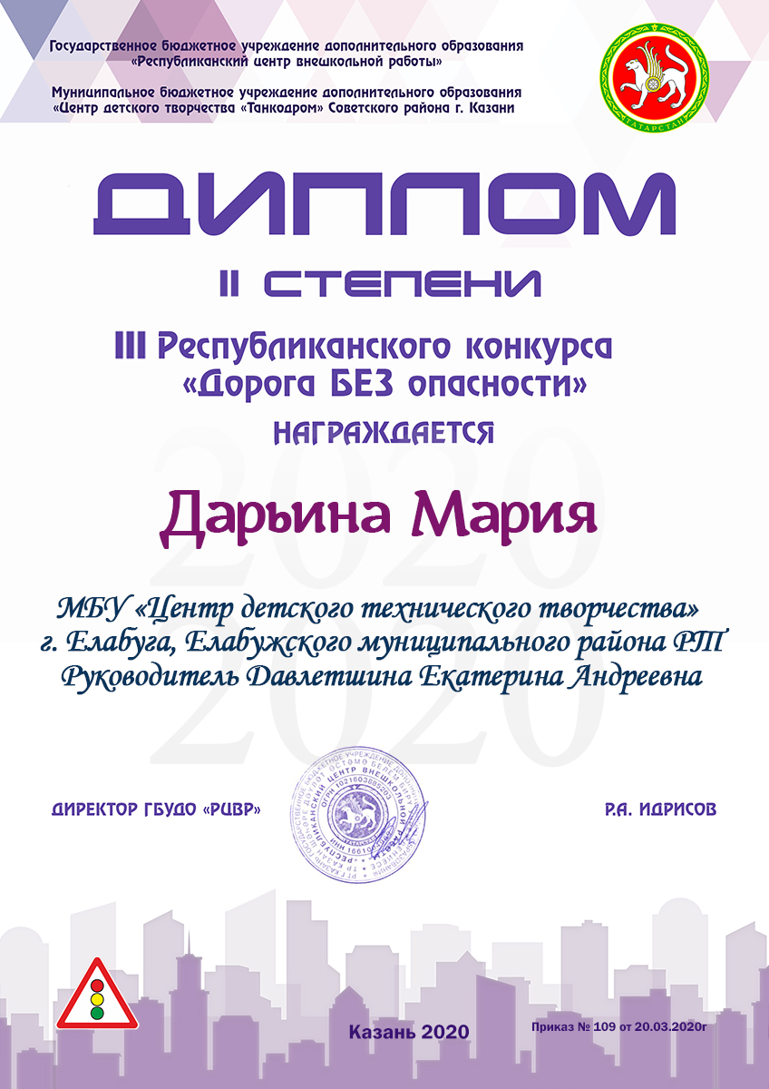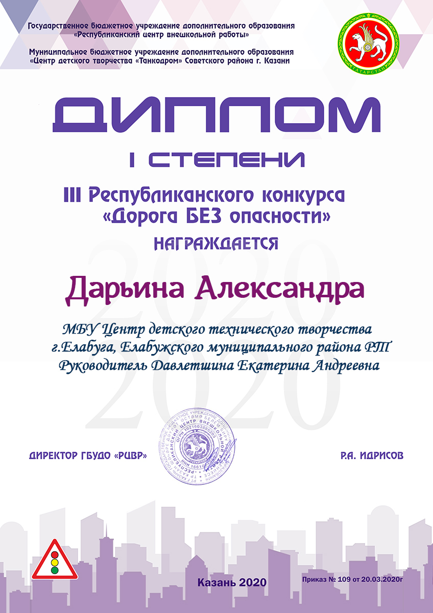 Дарьина Александра- диплом 1 степени, 3-й Республиканский конкурс "Дорога БЕЗ опасности"