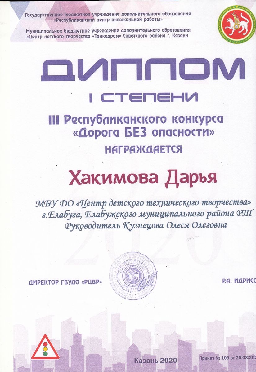 Хакимова Дарья - диплом 1 степени, 3-й Республиканский конкурс "Дорога БЕЗ опасности"