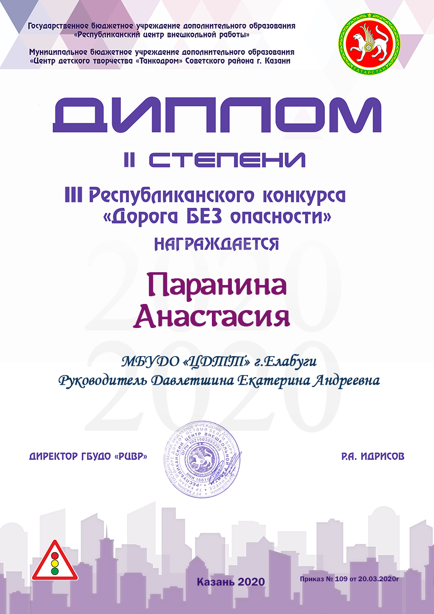 Паранина Анастасия - диплом2 степени, 3-й Республиканский конкурс "Дорога БЕЗ опасности"