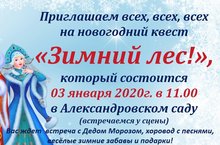 Приглашаем всех горожан принять участие в новогоднем квесте "Зимний лес", который состоится 03.01.2020 г. в 11.00 в Александровском саду.