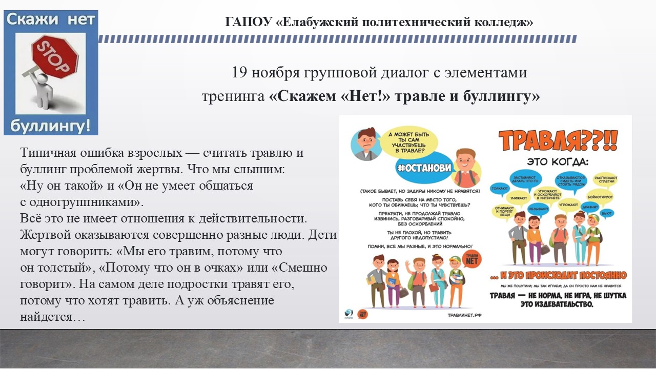 Для предотвращения вышеуказанных случаев и повышения психологической безопасности в колледже, 19 ноября педагогом-психологом и социальным педагогом с кураторами учебных групп и студентами 1-2 курсов, состоялся групповой диалог с элементами тренинга «Скажем «Нет!» травле и буллингу».