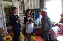 В связи с приближающимся праздником учащиеся школы совместно с главой поселения Бахметовым А.Б. и работниками СДК посетили тружеников тыла Сухорукову В.А. и Понамареву З.С.. Вручили подарки от президента РТ и прикрепили георгиевские ленточки.