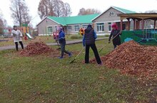 Территориябезне яфраклардан арындырып шимбә өмәсе оештырдык. Авылыбызның үзидарә оешмасыннан арба куелды, ике юл яфрак түгелде./ С коллективом вышли на субботник. Собрали две тележки выпавших листьев.