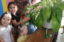 Кечкенә булсак та, гөлләр яратабыз. Аларга су сибәбез, төпләрен йомшартабыз, яфракларын коендырабыз.Гөлләребез дә яратканны аңлыйлар, шаулап үсәләр./ Мы очень любим ухаживать за нашими комнатными цветами. За наш труд они радуют нас своими цветами.