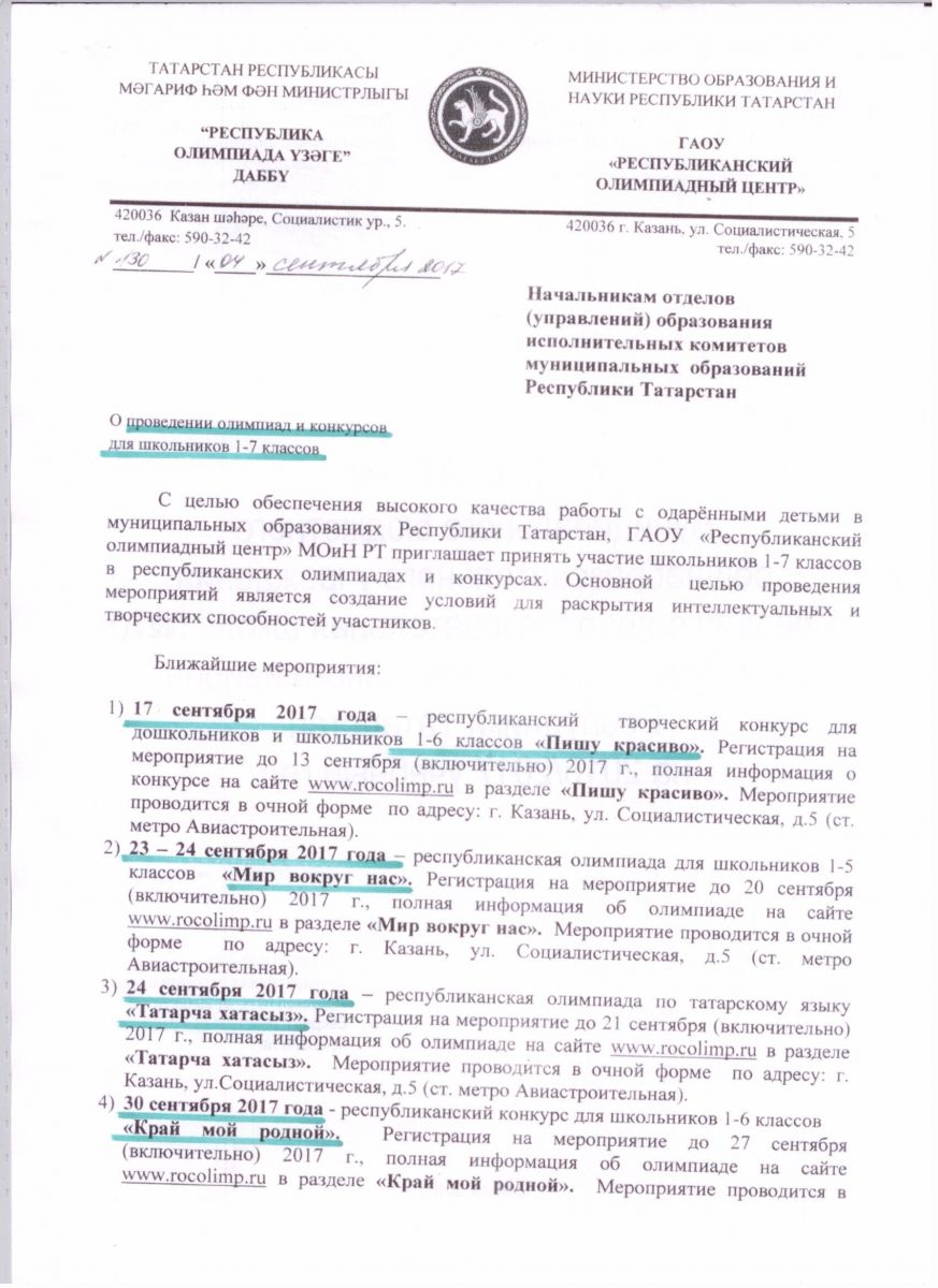 Республиканский олимпиадный центр МОиН РТ приглашает учащихся 1-7 классов принять участие в республиканских олимпиадах и конкурсах