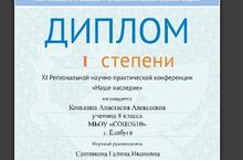 Поздравляем с победой ученицу 8 класса Конькину Анастасию и научного руководителя, учителя математики Санникову Галину Ивановну в XI Региональной научно-практической конференции "Наше наследие", которое проходило на базе Гимназии №4 15.04.2017