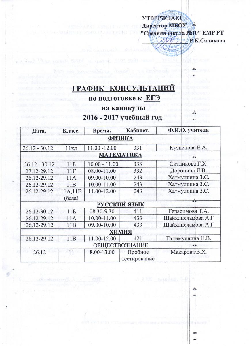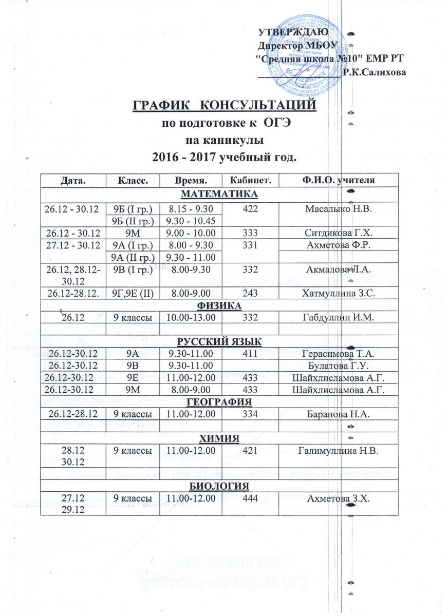 Графики консультаций по подготовке к ОГЭ и ЕГЭ во время зимних каникул 29.12.2016