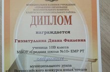 1.Гиззатуллина Диана, 10 В класс-победитель,учитель Герасимова Т.А.