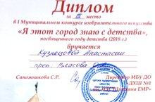 Поздравляем Кузнецову А., занявшую 3 место в муниципальном конкурсе изобразительного искусства «Я этот город знаю с детства». Учитель Власова О.А. Молодцы!!!