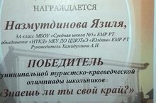 Поздравляем Локтева Д., Курникову А., Бычкова Э., Рахимову С., Пальчик Е., призеров муниципальной туристско-краеведческой олимпиады школьников «Знаешь ли ты свой край?». Учителя Хамидуллина А.Н., Гиздатуллина И.И., Ившина И.Г. Молодцы!!!