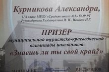Мәктәп укучыларының «Туган ягыңны беләсеңме? " муниципаль туристик-туган якны өйрәнү олимпиадасы призерларын Локтев Данил ., Курников Александра., Бычков Эдуард., Рәхимова Светлана., Пальчик Елизаветаны чын күңелдән котлыйбыз.». Укытучылары - Хәмидуллина Ә. Н., Гиздатуллина И. И., Ившина И. Г. Афәрин!!!