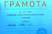 Поздравляем сборную школы, занявшую 2 место в Первенстве г. Елабуга по игре в дартс среди учащихся 10-11 классов, а также Кашеварову М. и Мифтахову А.А., призёров Первенства в личном зачёте. Руководитель Мифтахова А.А. Молодцы!!!