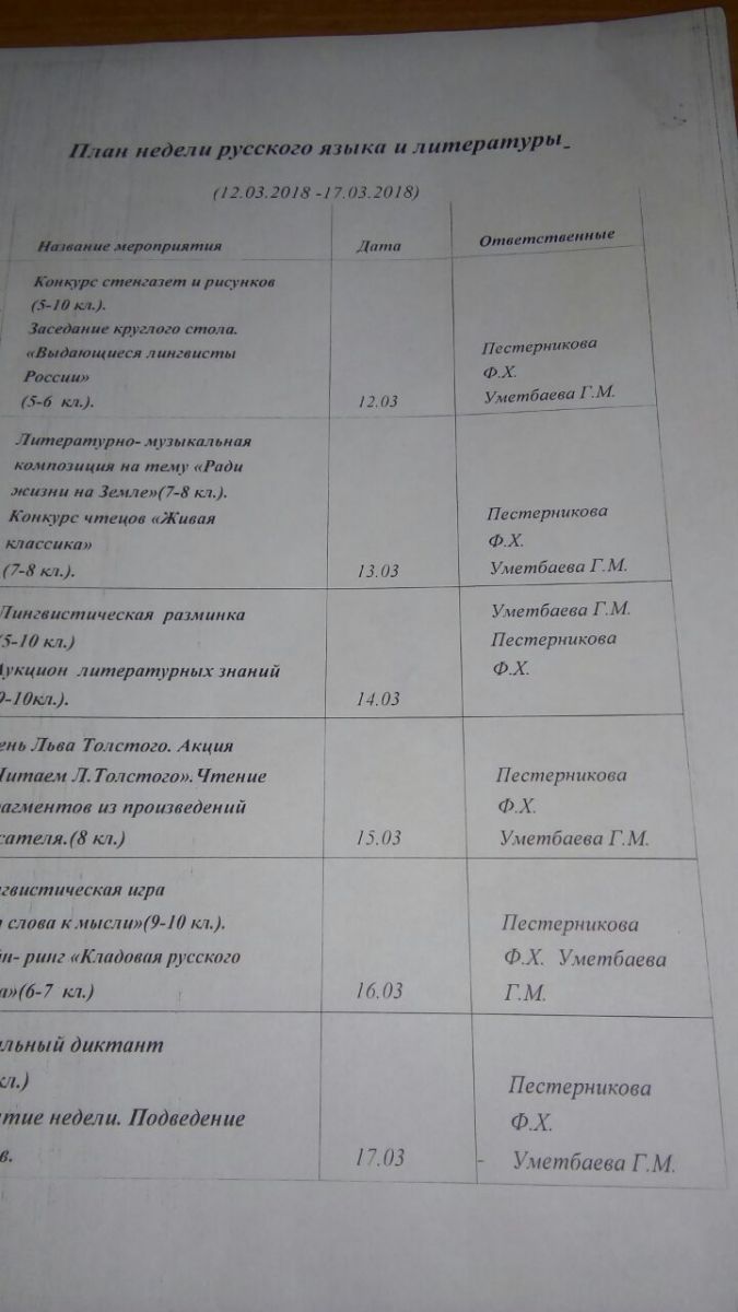 На прошлой неделе, с 12.03.18 по 17.03.18 в нашей школе прошла неделя русского языка и литературы. Были проведены различные мероприятия, а затем подведены итоги предметной недели. Победители поощрены грамотами и призами. ССЫЛКА на ФОТО. ССЫЛКА на документ (план).