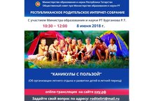 8 июня 2018 года состоится заседание Республиканского родительского интернет-собрания. Данный проект – совместная инициатива Министерства образования и науки Республики Татарстан и Общественного совета при Министерстве образования и науки Республики Татарстан. Тема заседания – «Каникулы с пользой?» С участием Заместителя Премьер-министра Республики Татарстан – Министра образования и науки Республики Татарстан Рафиса Тимерхановича Бурганова.