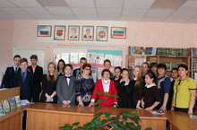 В целях воспитания у школьников чувства патриотизма, нравственных понятий, любви к Родине, родному краю 21 октября в школьной библиотеке СОШ № 6 состоялась встреча с местной поэтессой, краеведом, членом Союза писателей РТ, лауреатом литературной премии имени С. Сулеймановой, Гульзадой Ахтямовой. Баровой Л.А., зав.библиотекой была оформлена книжная выставка: «Җирле шагыйрь Гөлзада Әхтәмованың юбилее уңаеннан», подготовлена презентация, посвященная жизни и творчеству поэтессы: «Пять алмазов у тебя, пять алмазов…». Русскоязычные дети, учащиеся 8а и 8б классов, под руководством учителей татарского языка и литературы Фатхутдиновой Р.Г., Закиевой Р.К. и зам директора по УР по ВНО Вафиной Л.Ш., подготовили и читали ее стихи на татарском языке. Школьники получили много позитива от общения с Г. Ахтямовой. Все присутствующие на уроке сфотографировались.