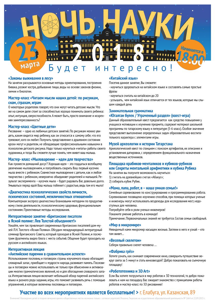 Внимание! 23 марта в 18.00 состоится "Ночь науки - 2018" по адресу г.Елабуга, ул.Казанская, д.89. Приглашаются все желающие, участие бесплатно. Будет очень интересно!