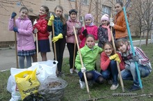Как радует нас майским днёмЦвет яблони и вишни!..И мы по-вешнему живём.С граблями, мётлами идём.Мы на субботник вышли.Михин Николай -