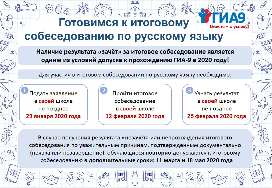 Итоговое собеседование - 2020 / Йомгаклау әңгәмәсе – 2020 11.02.2020Итоговое собеседование для обучающихся 9-х классов в 2019/2020 учебном году проводится 12 февраля 2020 года (во вторую среду февраля). В случае получения неудовлетворительного результата («незачет») за итоговое собеседование обучающиеся, экстерны вправе пересдать итоговое собеседование в текущем учебном году, но не более двух раз и только в дополнительные сроки, предусмотренные расписанием проведения итогового собеседования – 11 марта 2020 года (во вторую рабочую среду марта) и 18 мая 2020 года (первый рабочий понедельник мая).