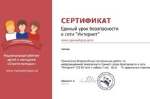 Всероссийская контрольная работа по информационной безопасности / Информацион куркынычсызлык буенча бөтенрәсәй контроль эше 09.12.2019На сайте Единого урока по безопасности в сети "Интернет" стартовала Всероссийская контрольная работа по информационной безопасности.Контрольная работа проходит до 16 декабря 2019 года. Учащиеся нашей школы принимают активное участие!В конце теста обучающийся может узнать сразу результаты своего тестирования, а также получить бесплатный электронный документ об успешном прохождении контрольной работы и об участии в Едином уроке безопасности в сети «Интернет» в 2019 году со своими результатами.