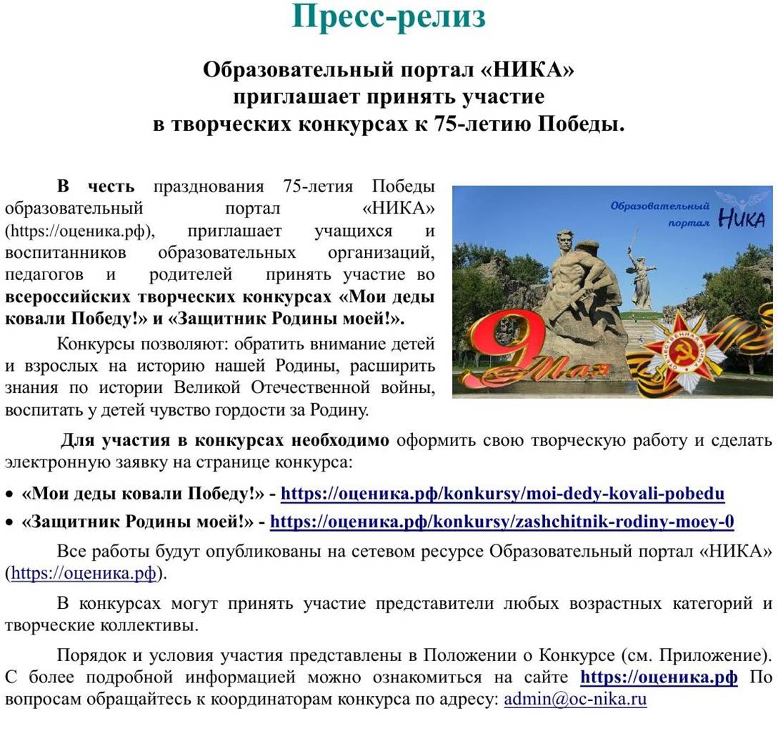 Прими участие во всероссийских творческих конкурсах к 75-летию Победы: «Мои деды ковали Победу!» и «Защитник Родины моей». Всю информацию смотри в приложении.