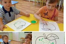 Первая младшая группа. Рисование пальчиком "Яблоко для ёжика". Малышам сложно управляться с кисточками и маркерами, зато незатейливое создание рисунков собственными пальцами вызывает бурю положительных эмоции. (Воспитатель Курчаева Р.В.)