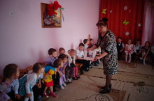 Старшие группы показывали утренник "С праздником Победы!" Дети слушали песни военных лет, читали стихи, танцевали. Муз.руководитель Ф.Зарипова рассказала детям историю появления георгиевской ленты.