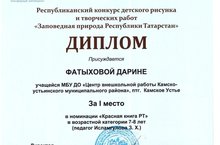 Фатыхова Д., учащаяся объединения дополнительного образования «Изобразительное творчество» МБУДО «Центр внешкольной работы», заняла 1 место в Республиканском конкурсе детского рисунка и творческих работ «Заповедная природа Республики Татарстан», номинация «Красная книга Республики Татарстан».