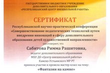 22 декабря 2016 года прошла Республиканская научно-практическая конференция «Совершенствование педагогических технологий путем внедрения инноваций в сферу дополнительного образования детей художественной направленности» на базе МБУ ДО «Детская школа искусств №15» Ново-Савиновского района г. Казани. Педагог дополнительного образования Центра внешкольной работы Сабитова Р.Р. приняла участие в конференции и провела мастер-класс на тему: «Фантазии на камне».