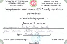 По итогам Республиканского этапа XVIII Международного фестиваля «Детство без границ» в конкурсе компьютерных презентаций «За Родину, Добро и Справедливость!» Хайбулина Рената из МБОУ «Затонская СОШ» (руководитель Хайбулина З. Р.) заняла 3 место.